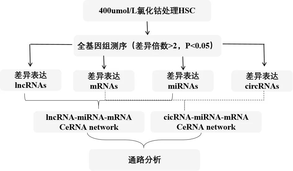 按照我们之前的研究结果,本研究采用400 μmol/L氯化钴(cobalt chloride,CoCl2)处理 HSC-T6细胞,利用全基因组测序鉴定缺氧处理后HSC中差异表达的mRNAs、miRNAs、circRNAs和lncRNAs。接下来,我们基于缺氧诱导的HSC中lncRNAs/circRNAs、miRNAs和mRNAs之间的相互作用构建了ceRNA网络,并基于公共数据库和文献进行了通路分析(图1)。