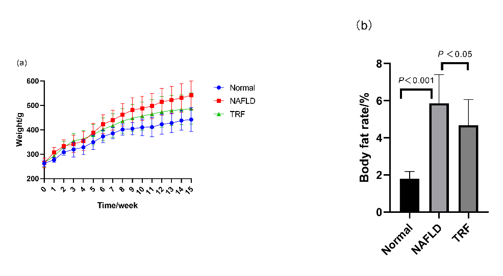 本实验第15周末,Normal组、MAFLD组及TRF组大鼠体重分别为441.8±48.8 g、541.4±58.3 g及486.5±63.6 g,Normal组(P=0.001)和TRF组(P=0.044)体重均小于MAFLD组。Normal组、MAFLD组及TRF组大鼠体脂比存在差异(P<0.001),MAFLD组大鼠体脂比显著高于Normal组(P<0.001)及TRF组(P<0.05),详见图1。