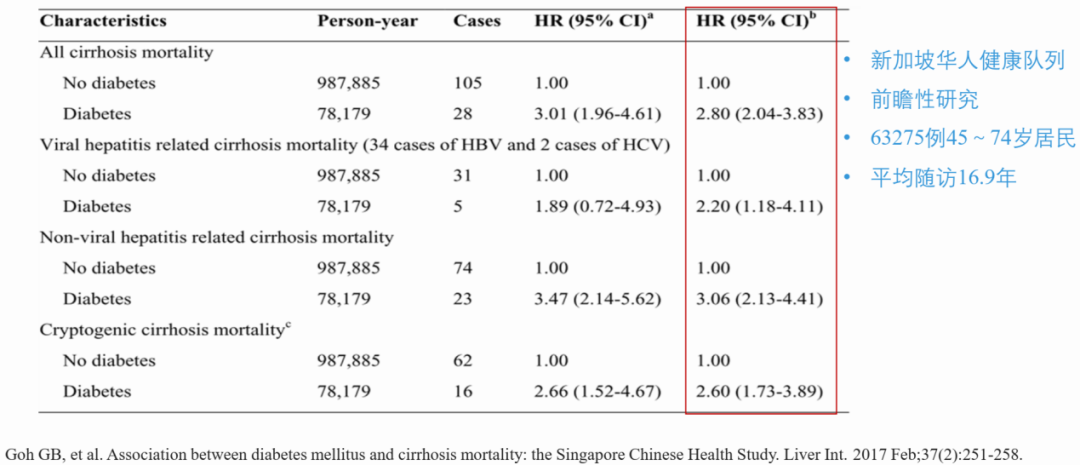 2. Goh GB, et al. Association between diabetes mellitus and cirrhosis mortality: the Singapore Chinese Health Study. Liver Int. 2017 Feb;37(2):251-258.