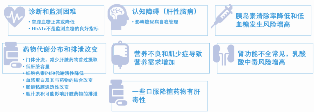 肝硬化患者糖尿病管理的难点包括诊断和监测困难、认知障碍(肝性脑病)、胰岛素清除率降低和低血糖发生风险增高、药物代谢分布和排泄改变、营养不良和肌少症导致营养需求增加、肾功能不全常见,乳酸酸中毒风险增高、一些口服降糖药物有肝毒性等。