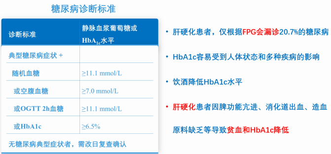 诊断和监测面临的主要困难是肝硬化患者空腹血糖(FPG)正常或偏低,以及糖化血给蛋白(HbA1c)并不是准确反映血糖水平的良好指标。肝硬化患者仅根据FPG会漏诊20.7%的糖尿病。ADA建议,当HbA1c≥6.5%即诊断为糖尿病,但是HbA1c容易受到人体状态和多种疾病的影响。例如,饮酒可以独立于血糖变化而降低HbA1c水平;HbA1c水平与红细胞寿命成正相关,肝硬化患者因脾功能亢进、消化道出血、造血原料缺乏等导致贫血和HbA1c降低,从而降低HbA1c诊断糖尿病的敏感性。