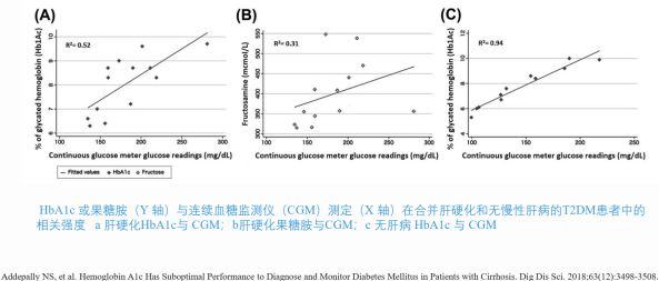 HbA1c也不适合用于肝硬化合并糖尿病患者的血糖监测,特别是合并贫血或肝功能明显损伤患者。HbA1c受到肝硬化本身和肝功能不全严重程度的影响,在Child-Pugh B级和C级患者,HbA1c会低估真实血糖水平。2018年一项回归分析显示,与无肝硬化的糖尿病(DM-NoCirr)患者(R2=0.94)相比,合并肝硬化的糖尿病(DM-Cirr)患者(R2=0.52)中HbA1c与连续血糖监测(CGM)之间的关联较差,并且果糖胺并未改善其在DM-Cirr (R2=0.31)患者中的关联。