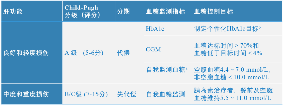 表4. 肝硬化合并糖尿病患根据肝功能选择降糖药物的基本原则