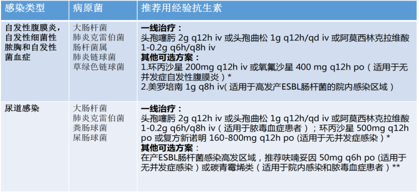 表1. ESLD合并感染的常见部位、病原菌和经验用药