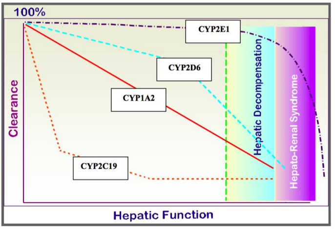 研究显示,细胞色素P450(CYP450)酶系统是药物代谢的关键酶,药物通过CYP450清除,随着肝功能恶化,药物清除下降。不同药物经不同肝代谢酶代谢,即使肝功能水平类似,血药浓度也有差异(图2)。