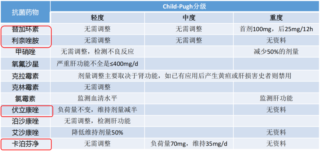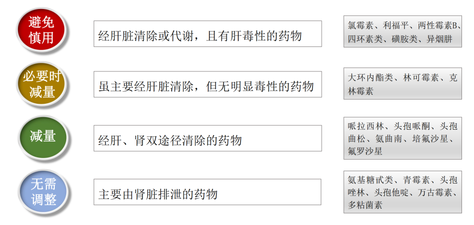 随排泄途径不同,常见抗菌药物在ESLD中的使用分为慎用、必要时减量、减量和无需调整(图3)。