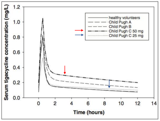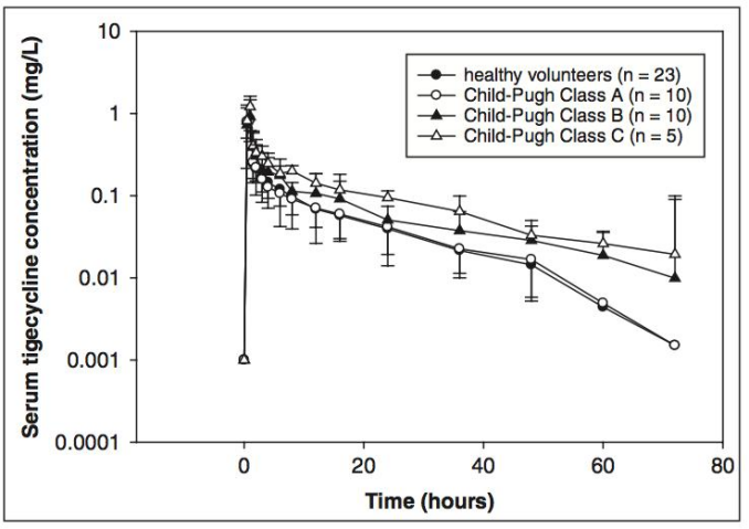 2011年一项评估替加环素在不同程度肝硬化中的PK特点的研究,受试者包括肝硬化组25例(其中Child-Pugh A级10例,B级10例,C级5例)和健康对照组23例,100 mg静脉滴注单次给药,给药后按时间点留取血样检测血药浓度。
