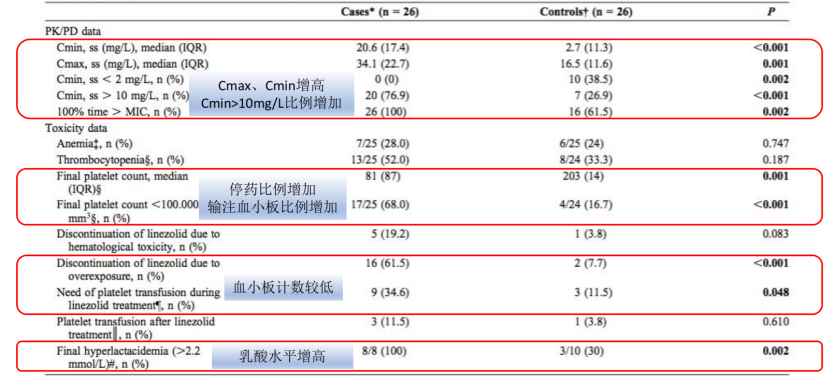 结果表明,肝硬化患者出现利奈唑胺血药浓度升高(>10 mg/L)是非肝硬化患者的11.4倍,利奈唑胺的血药浓度与乳酸水平呈正相关。肝硬化患者中标准剂量(600 mg q12h)利奈唑胺血药浓度显著升高,发生血小板减少及需要输注血小板比例显著升高,提示肝硬化患者在应用利奈唑胺治疗时应行TDM,全面评估疗效及安全性。