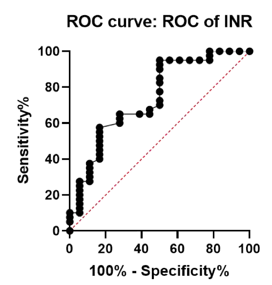 结果显示,肝衰竭组伏立康唑血药浓度明显高于早中期肝硬化组(P=0.036),肝衰竭患者中伏立康唑血药浓度异常发生率高于早中期肝硬化组(P=0.010)。多因素回归分析显示,INR是影响肝衰竭患者中伏立康唑血药浓度升高的独立预测因素(OR=4.007, P=0.033)。INR预测伏立康唑血药浓度异常AUC为0.746,最佳临界值为1.67,判断伏立康唑血药浓度异常的阳性灵敏度为95%,特异性为50%(图6)。