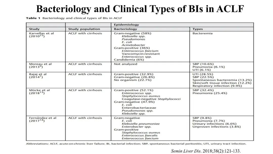 ACLF常常合并有细菌感染的情况,往往导致了高死亡率。目前已开发出多个诊断、预测模型供临床医师参考。当ACLF患者合并有感染的情况时,应在送检合格标本明确病原体的前提下尽快进行经验性抗生素治疗,在治疗过程中,应高度关注患者的耐药情况,尽可能减少耐多药细菌的产生。预期进行肝移植手术的患者,由于这类患者一旦发生感染,手术效果不佳,因此,应当更加关注患者的感染情况,并及时进行充分的治疗。