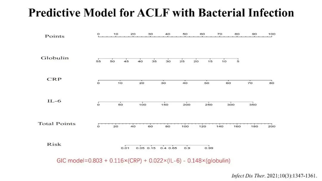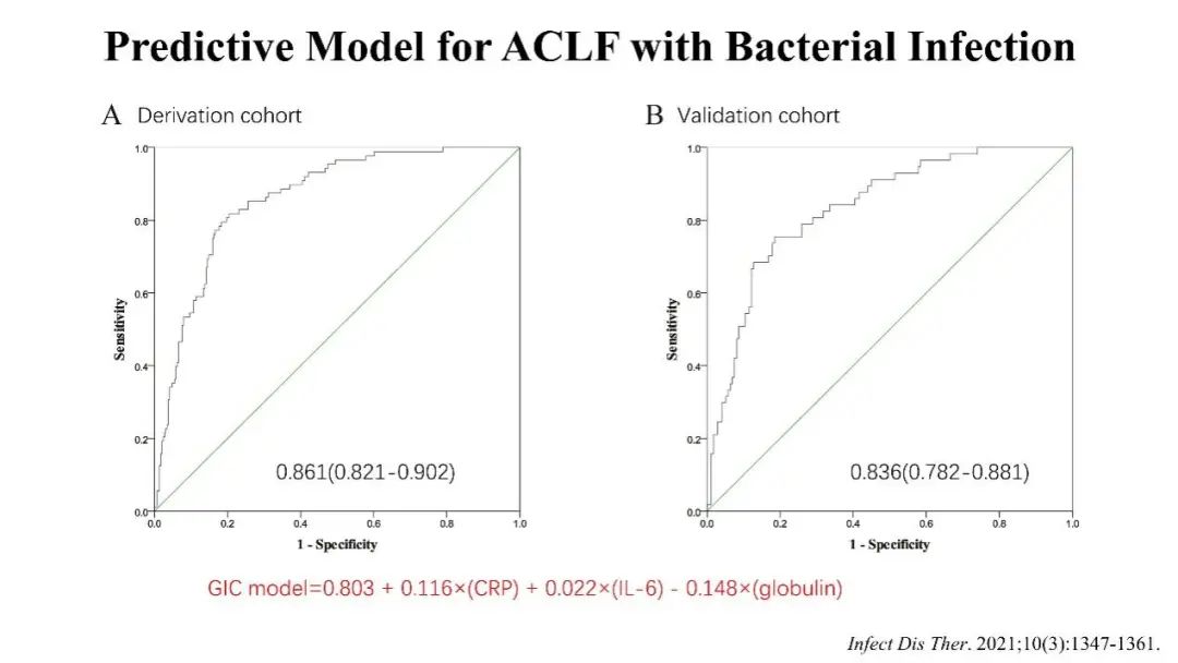 上述研究多集中在细菌感染的早期诊断,目前尚缺乏明确的预测模型。本研究所基于来自华中科技大学同济医学院附属同济医院感染科的HBV相关ACLF患者队列,首次建立了HBV相关ACLF患者合并细菌感染的预测模型,并在验证队列中验证了该模型对HBV相关ACLF患者发生感染具有较好的预测价值(图5、6)。