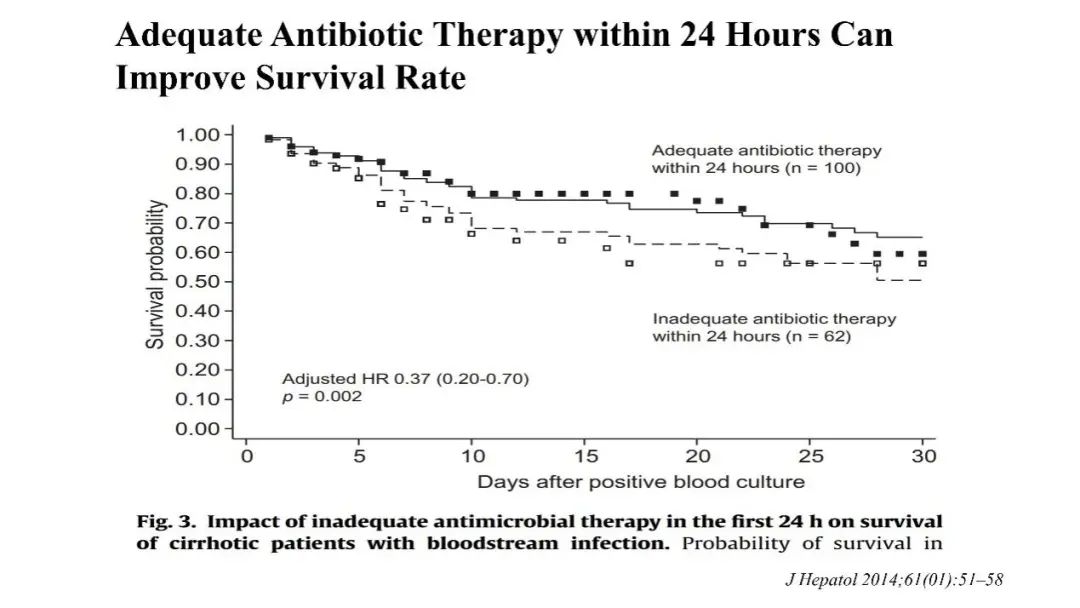 图7. 24h内启动合适的抗生素治疗有利于改善肝硬化合并血液感染患者生存