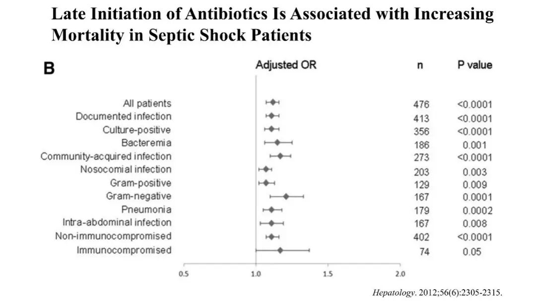 图8. 延迟使用抗生素于脓毒症休克患者死亡率增加相关