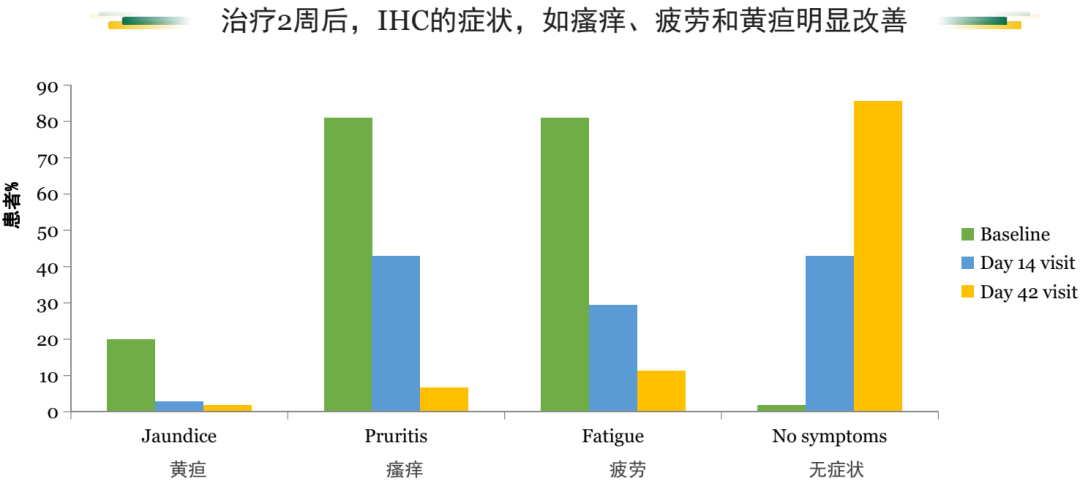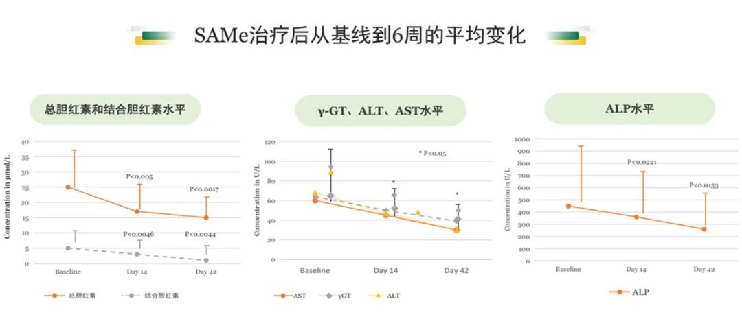 结果显示,SAMe治疗有效减少了IHC的症状,黄疸、瘙痒和疲劳在治疗2周后缓解并在整个研究过程中持续改善;抑郁情绪也得到改善,无抑郁情绪的患者比例从基线时的37.7%增加到第14天的56.2%和第42天的61.6%;肝酶(TB、ALT和AST)和胆酶(GGT)水平均在SAMe治疗2周后显著降低。相关性分析表明,实验室标志物的改善与DILI和IHC临床症状的消失具有显著的统计学相关性。