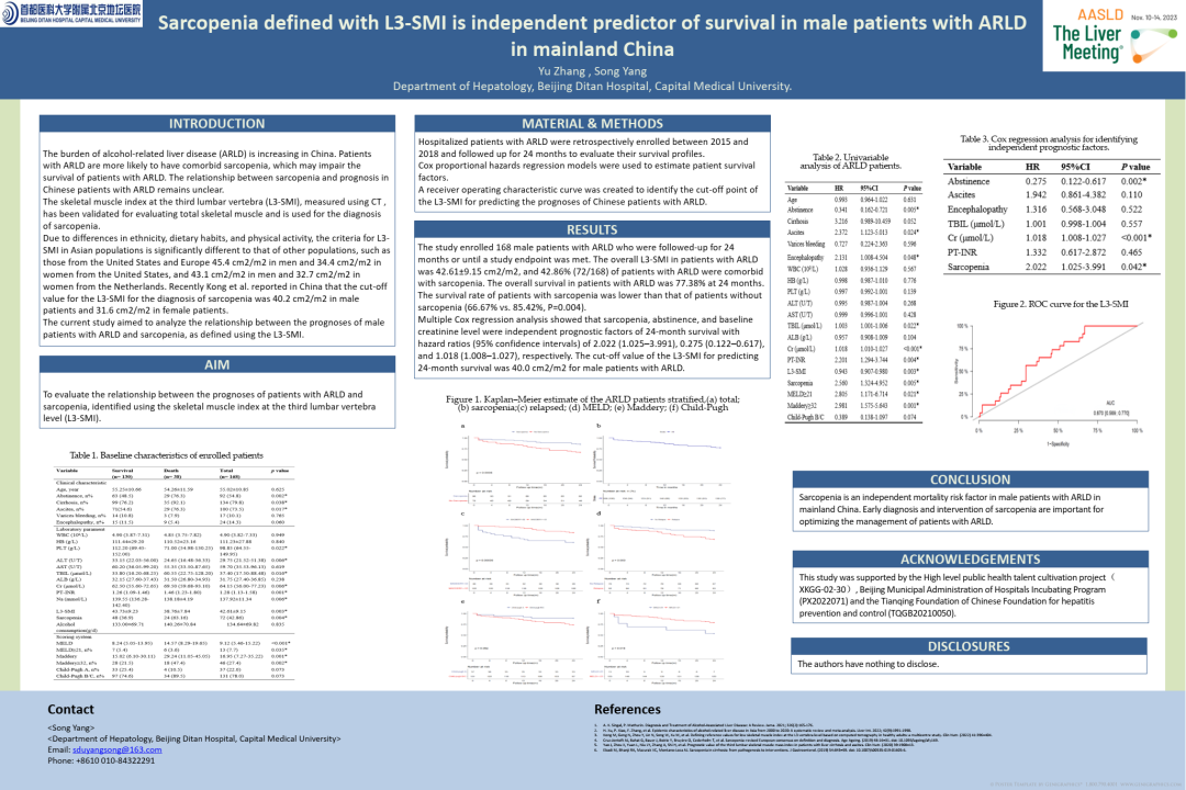 2023年11月10日~14日,肝病学领域国际年度压轴大戏——美国肝病研究学会年会(AASLD2023)于美国波士顿隆重举行。首都医科大学附属北京地坛医院杨松教授团队在酒精性肝病领域的两项科研成果入选大会壁报交流,其研究发现:以L3-SMI定义的肌少症是中国大陆酒精性肝病患者生存的独立预测因素,MELD 3.0在预测中国酒精性肝病患者生存方面的作用并不优于MELD-Na。《国际肝病》特此报道,相关内容分享如下。