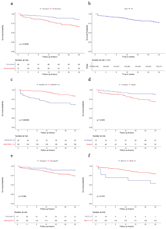 注:a:总体,b:肌少症;c:再饮酒,d:MELD评分,e:Maddery判别函数,f:Child-Pugh.