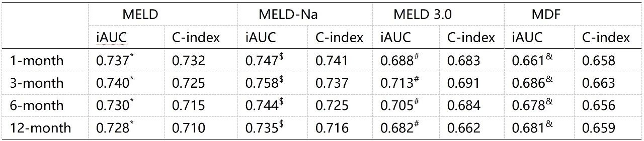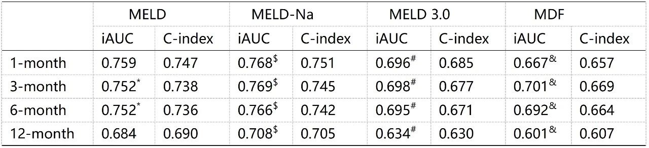 注:MELD:终末期肝病模型;MDF: Madderey判别函数;iAUC: 整合的曲线下面积;C-index:C指数;month:月。不同模型在预测不同时间节点酒精性肝炎患者死亡率方面的作用被比较,*$#&p<0.05被认为有统计学差异。(* MELD比较MELD 3.0;# MELD-Na比较MELD 3.0;$ MELD比较 MDF;& MELD-Na比较MDF)