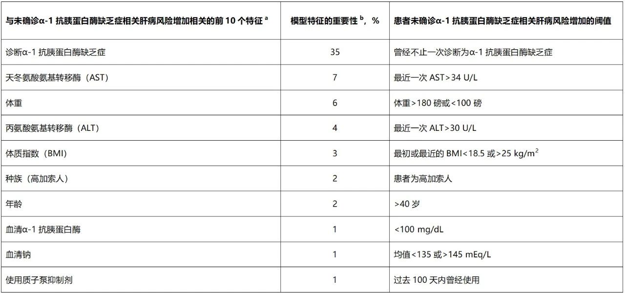 根据上述研究结果,研究人员得出结论:对未确诊α-1抗胰蛋白酶缺乏症相关肝病最具预测性的特征是先前的α-1抗胰蛋白酶缺乏症诊断(35%)和AST水平(7%)。然而,由于α-1抗胰蛋白酶缺乏症是一种未被充分诊断的疾病,在普通人群中,使用AI/ML-CDST识别α-1抗胰蛋白酶缺乏症相关肝病患者可能受到限制。未来的模型改进和前瞻性验证,可以检验该工具大规模部署的效用,可望用于专业实践,支持对α-1抗胰蛋白酶缺乏症相关肝病患者的识别。