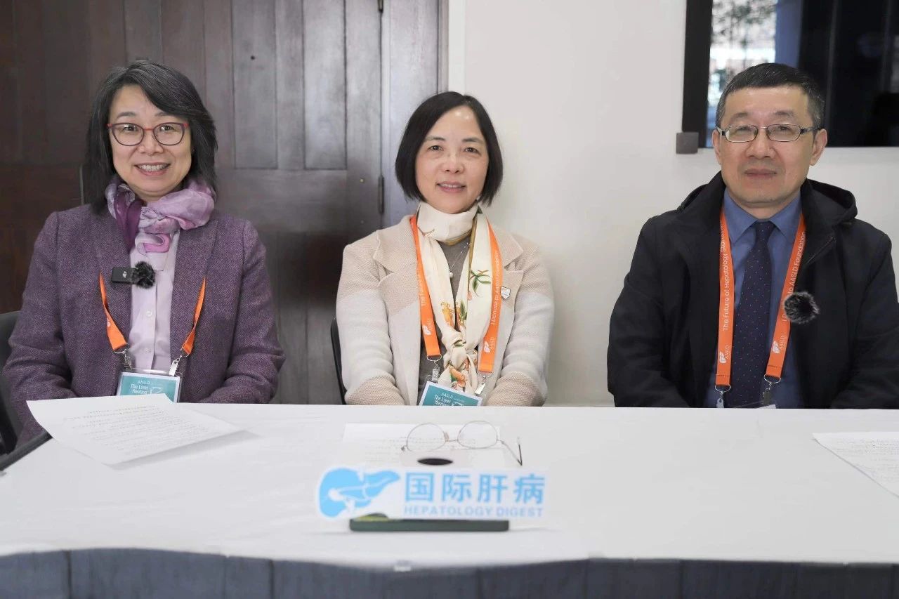 郭列军(Grace L. Guo)教授(左)、周慧萍(Huiping Zhou)教授(中)、范建高教授(右)在AASLD现场接受采访