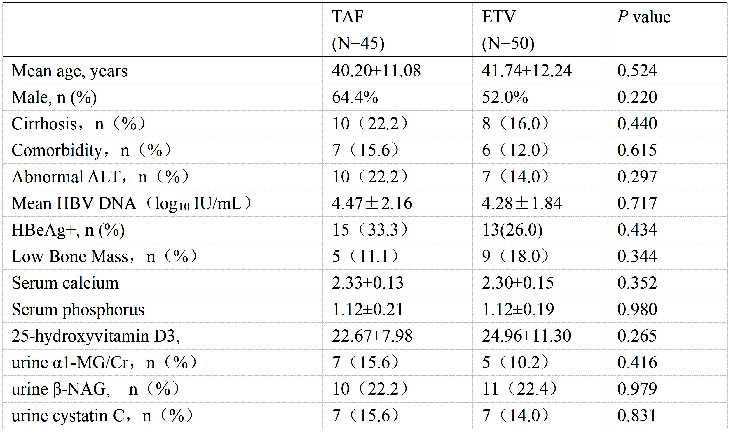 第96周随访时,TAF组尿α 1-微球蛋白异常率(5.3% vs. 25.6%,P=0.014)、β-N-乙酰氨基葡萄糖苷酶异常率(7.9% vs. 30.8%,P=0.011)、尿胱抑素异常率(6.1% vs. 10.5%,P=0.026)显著低于ETV组。TAF组的血清肌酸酐异常率较低(7.9% vs. 12.8%)。在髋关节和脊柱BMD测量中,TAF的低骨量百分比在数值上低于ETV(11.8% vs. 21.7%,P=0.412)。TAF组HBV DNA<20 IU/mL的患者比例为97.8%(44/45),ETV组为96.0%(48/50)。