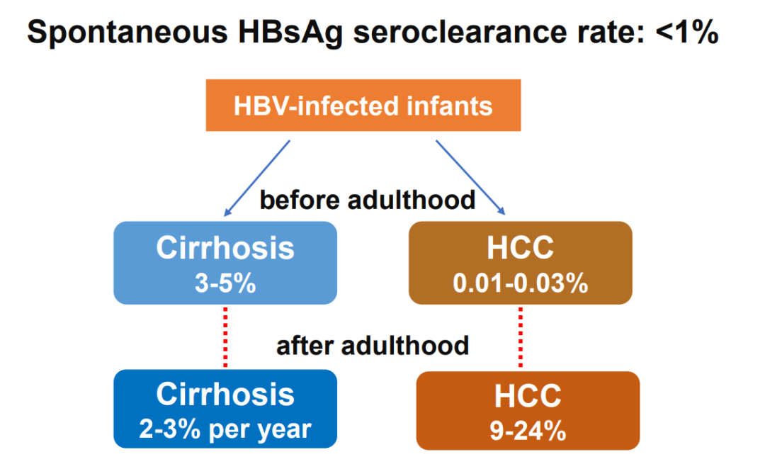 慢性HBV感染多起始于围产期或婴幼儿时期感染,且慢性化率整体较高。现有数据表明[2-4],在围产期和婴幼儿时期发生的HBV感染,分别有90%和20%~50%将发展成慢性感染,而5岁以后感染HBV的慢性化比例约5%~10%。由此可见,对于儿童期HBV感染者,年龄越小,慢性化率越高。研究显示,婴幼儿自发的HBsAg清除率非常低,不足1%。虽然儿童时期慢性HBV感染很少出现活动性肝炎进展,但仍有3%~5%和0.01%~0.03%的患儿在成年前进展为肝硬化和肝细胞癌(HCC);成年后每年发生肝硬化的风险为2%~3%,而发生肝细胞癌的风险则为9%~24%[4-5]。
