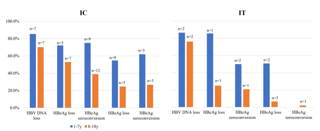 临床治愈是CHB抗病毒治疗的理想终点,即停止治疗后仍保持HBsAg阴性(伴或不伴抗-HBs出现)、HBV DNA检测不到、肝脏生化指标正常。那么,HBV感染儿童及早抗病毒治疗是否可以实现临床治愈?对此,王福生院士首先分享了一项系统综述与荟萃分析研究。该研究系统分析了18篇报告18岁以下儿童抗病毒治疗应答情况的文献,结果发现,HBV感染儿童起始治疗年龄或可作为临床治愈的预测因素。数据显示,儿童HBV感染者接受抗病毒治疗后,1~7岁患儿的整体临床应答率高于8~18岁,应答指标包括HBV DNA转阴率、HBeAg转阴率、HBeAg血清转换率和HBsAg转阴率,且1~7岁临床治愈率显著高于8~18岁(图2)。纳入的多项研究结果表明,1~7岁患儿抗病毒应答率更高;针对不同临床分期(IC、IT)患儿,低龄期启动治疗均有利于临床治愈(图3)。