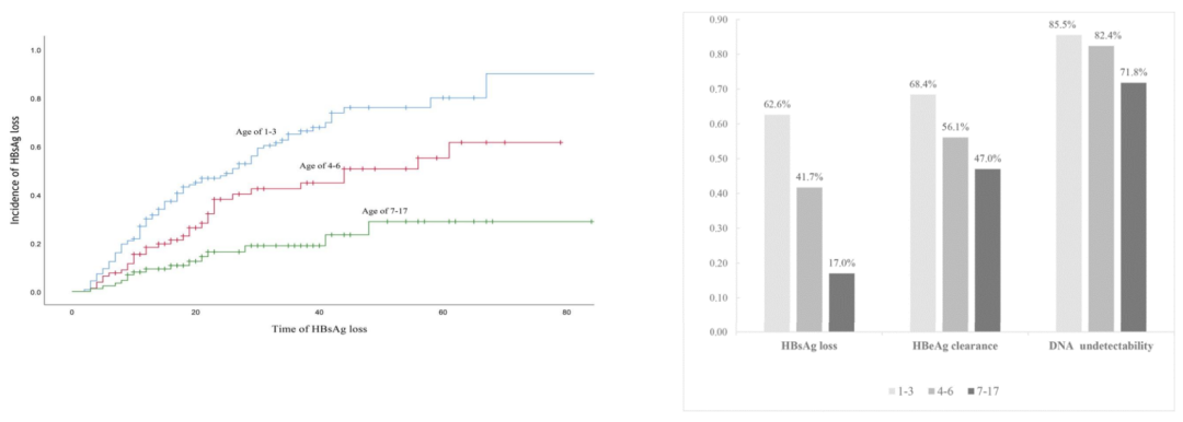 此外,来自湖南省儿童医院发表的一项研究表明,患儿接受抗病毒治疗,起始治疗年龄越低,临床应答率越高。数据显示,治疗后,1~3岁年龄组患儿出现HBsAg转阴时间较早;整体上看,各年龄组中的多数患儿均在治疗后40个月出现临床结局(图4);我们国家感染性病临床医学研究中心团队在免疫清除期的慢乙肝患儿中,3岁以下患儿抗病毒治疗后累积HBeAg血清学转换率最高(图5)。同时也表明低龄是乙肝患儿实现功能性治愈的优势因素,年龄越小,抗病毒治愈率越高(图6),论文发表在近期Hepatology International杂志。
