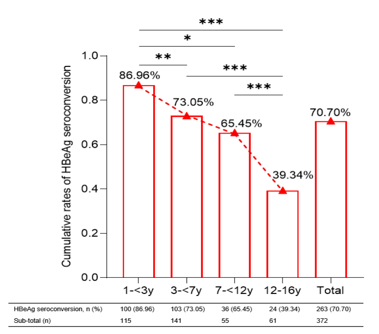 图5. 不同年龄组患儿的累积HBeAg血清学转换率