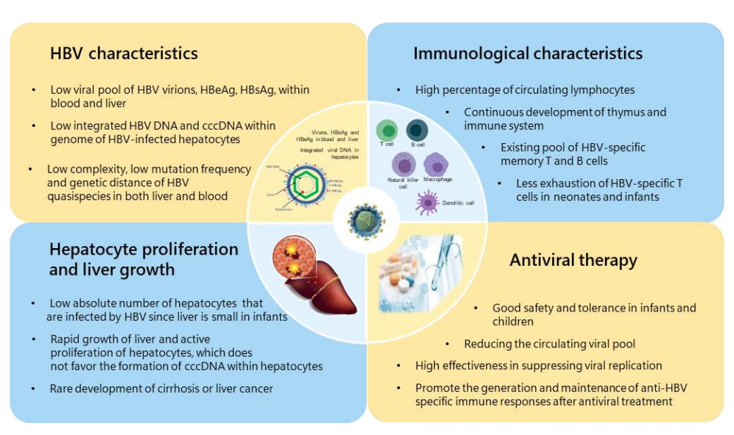 关于幼龄HBV感染患儿抗病毒治疗实现临床治愈率高这一现象背后的机制迄今仍未阐明,对此,王福生院士团队总结了四点原因:①儿童HBV感染时间短,生命早期肝脏处于生长期,受到感染的肝细胞绝对数量少,体内HBV病毒库、HBsAg绝对量小;②由于感染时间短,病毒共价闭合环状 DNA(cccDNA)与染色体发生整合概率的可能性低于成人患者;在肝细胞生长分裂期,子代新生肝细胞会丢失cccDNA;③儿童免疫系统具有特殊性,婴幼儿期胸腺发育,6岁以前外周血淋巴细胞百分比较成人高,儿童免疫系统能够产生抗病毒的免疫应答;④抗病毒治疗可能有助于抑制体内病毒复制,新增殖的肝细胞不会被HBV感染,因而患儿更易实现临床治愈。