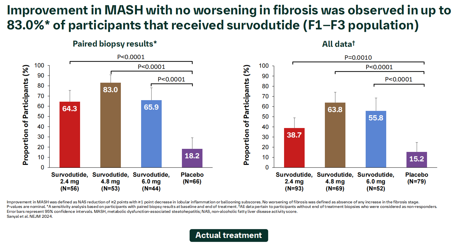 1. Sanyal AJ, Bedossa P, Fraessdorf M, et al. Glucagon and GLP-1 receptor dual agonist Survodutide improved liver histology in people with MASH and fibrosis: Results from a randomized, double-blind, placebo-controlled phase 2 trial. EASL 2024 oral.