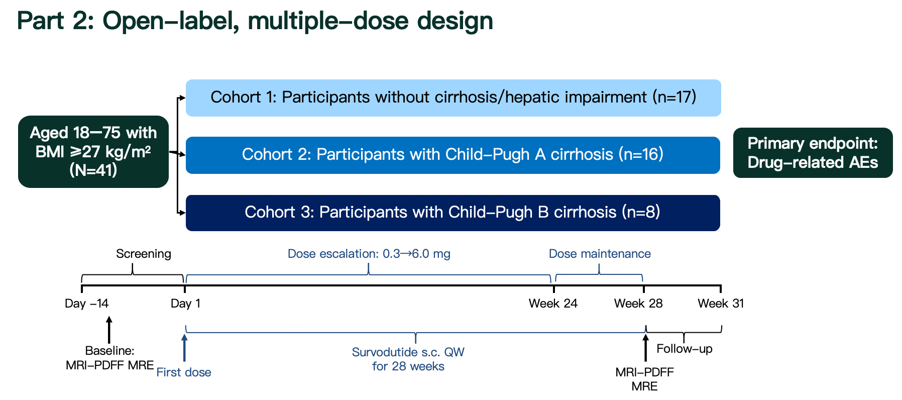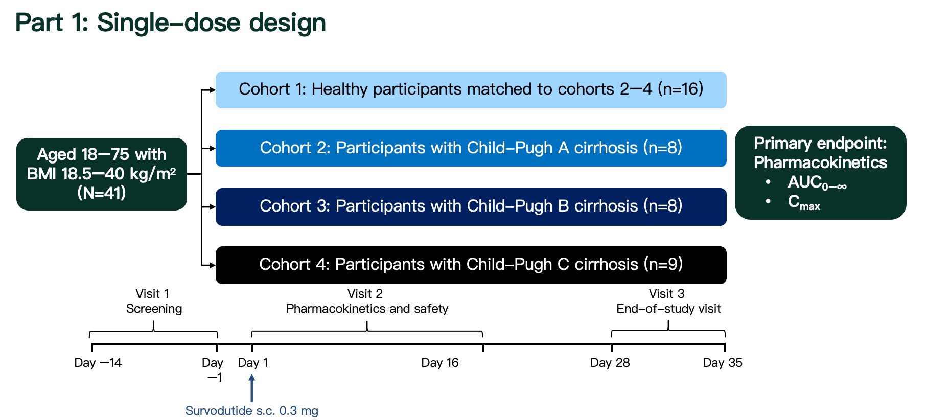 本研究是一项多国、开放标签、I期试验。研究分为2个部分,第1部分首先评估了单次皮下注射0.3 mg Survodutide在不同程度的肝硬化患者[Child-Pugh A级(n=8), Child-Pugh B级(n=8)或Child-Pugh C级(n=9)]以及与其年龄、性别和体重相匹配的健康个体(包括肥胖和非肥胖个体,n=16)的PK,主要终点为血药浓度-时间曲线下面积(AUC0-∞)和最大血浆浓度(Cmax)。在第1部分单剂量PK试验完成后,24例超重/肥胖的代偿性或失代偿性肝硬化患者[其中21例由MASH引起(87.5%);Child-Pugh A级16例,Child-Pugh B级8例]和17例无肝硬化患者接受了Survodutide每周一次的皮下注射治疗,24周内剂量滴定至6.0 mg,随后维持治疗4周;主要终点是评估药物相关不良事件,并对肝脏变化进行描述性评估。
