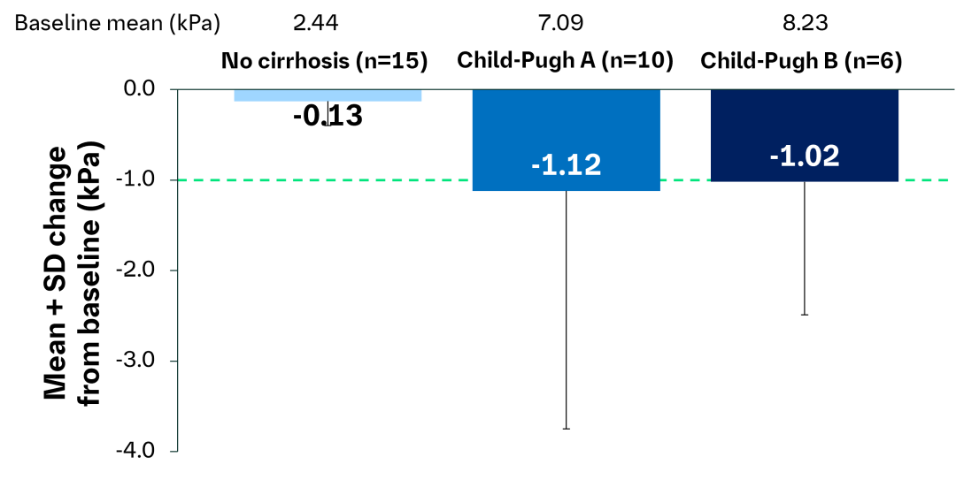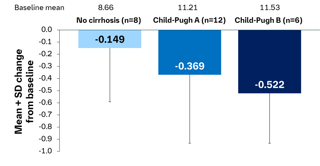 24周药物治疗阶段,无肝硬化患者中有14例(82.4%)发生药物相关不良事件(未致命/危及生命),Child-Pugh A级和B级肝硬化患者中分别有14例(87.5%)和7例(87.5%)。其中,胃肠道不良事件是最为常见的药物相关不良事件,无肝硬化患者、Child-Pugh A级和B级肝硬化患者中分别有14例(82.4%),12例(75.0%)和6例(75.0%)发生胃肠道不良事件。