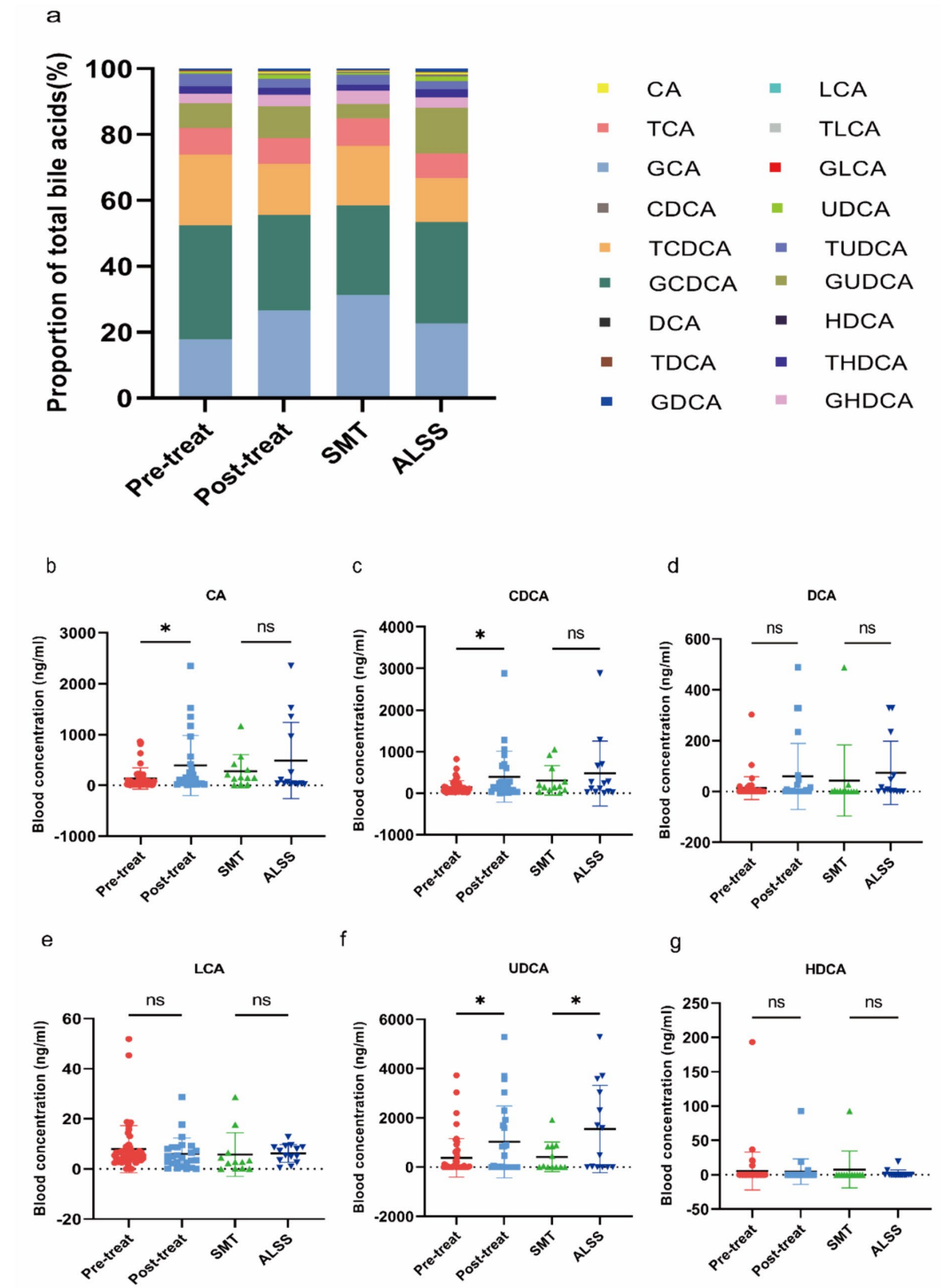 与治疗前组比较,治疗后组的总原发性BAs和总继发性BAs浓度没有显著差异。同样,比较ALSS组和SMT组数据,总原发性和继发性BAs浓度没有显著差异。这表明ALSS对原发性和继发性BAs的总体组成没有显著影响。