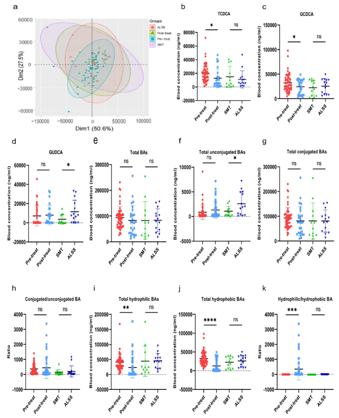 与治疗前组相比,治疗后组总亲水性BAs和总疏水性BAs浓度显著降低(P<0.05)(图5i、j),但总亲水性BAs与总疏水性BAs的比值增加(P<0.05)(图5k)。将ALSS组与SMT组进行比较,未观察到总疏水BAs和总亲水BAs的浓度差异。