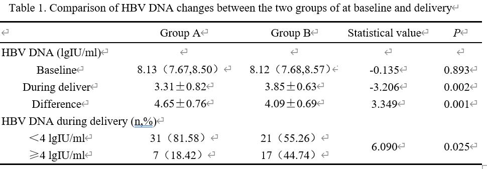 表1.两组受试者在基线与分娩时HBV DNA改变的比较