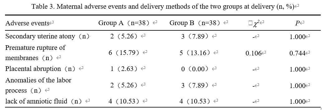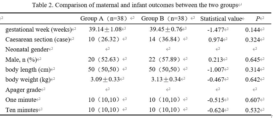 两组在分娩孕周和剖宫产率方面差异无统计学意义(P>0.05)。两组新生儿出生时的一般状况差异也无统计学意义(P>0.05),如表2所示。