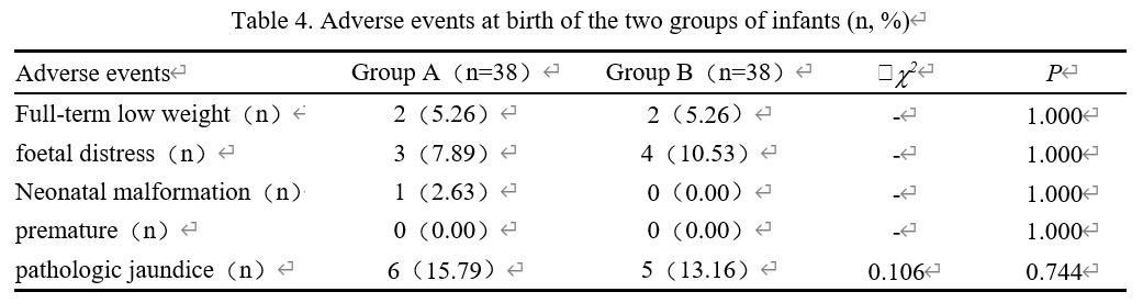 关于母婴不良事件的发生情况,两组孕妇之间的比较差异无统计学意义,如表3所示。两组新生儿不良事件的情况也相同,如表4所示。A组中一名新生儿出生时患有六趾畸形,其母亲在孕24周时开始服用TDF。