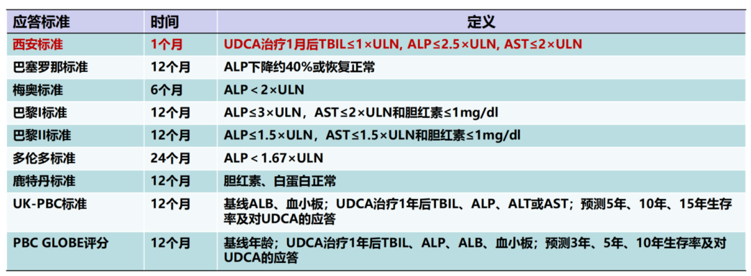 评估PBC对UDCA治疗的应答至关重要。对UDCA应答不佳的患者疾病进展较快,判断应答情况后可以及时启动二线治疗,阻止疾病进展,减少肝硬化失代偿事件的发生,推迟肝移植时间。国际上不同的指南共识标准对PBC的治疗应答评估略有差异,具体评价标准如下(表1)。其中,韩英教授团队基于一项长期研究的随访结果,制定了“西安标准”[2],即UDCA治疗1个月后评价应答的新标准(ALP≤2.5×ULN,AST≤2×ULN,TBIL≤1×ULN);以“西安标准”定义的UDCA应答者5年无不良结局生存率为97%,显著高于无应答者(64%)。“西安标准”能够准确区分快速进展人群,使患者能更早期地接受二线治疗。