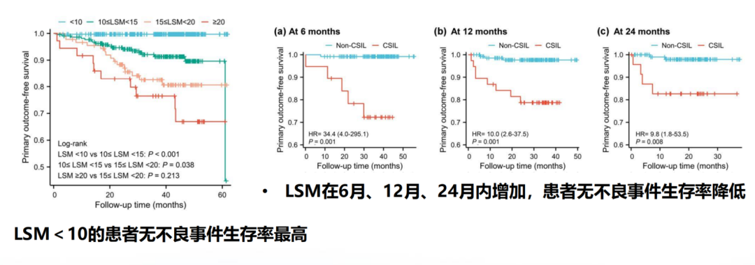 为验证这一方法,韩英教授团队开展了一项研究[4],使用基于瞬时弹性成像技术的无创肝脏检测系统探索了LSM在PBC患者中的预后价值。研究对有临床意义的LSM增加(CSIL)定义为10≤LSM<15 kPa患者LSM增加>20%,或LSM增加至>15 kPa。12个月时,出现CSIL的患者发生不良预后事件的比例数量为21%,未出现CSIL的患者发生不良预后事件的比例为2%。CSIL使PBC患者的主要进展风险增加了9.96倍。LSM<10 kPa的PBC患者3年不良预后事件发生风险<1%,可忽略不计(图1)。研究显示,LSM和ΔLSM/ΔT(LSM进展速度)是主要不良预后事件发生的独立危险因素。