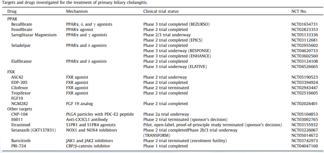 对UDCA应答反应不佳的PBC患者,应早期启动二线药物治疗。目前PBC二线药物可分为FXR激动剂和过氧化物酶体增殖物激活受体(PPARs)激动剂两类。韩英教授团队汇总了目前在研的PBC治疗药物(表2)[6]。