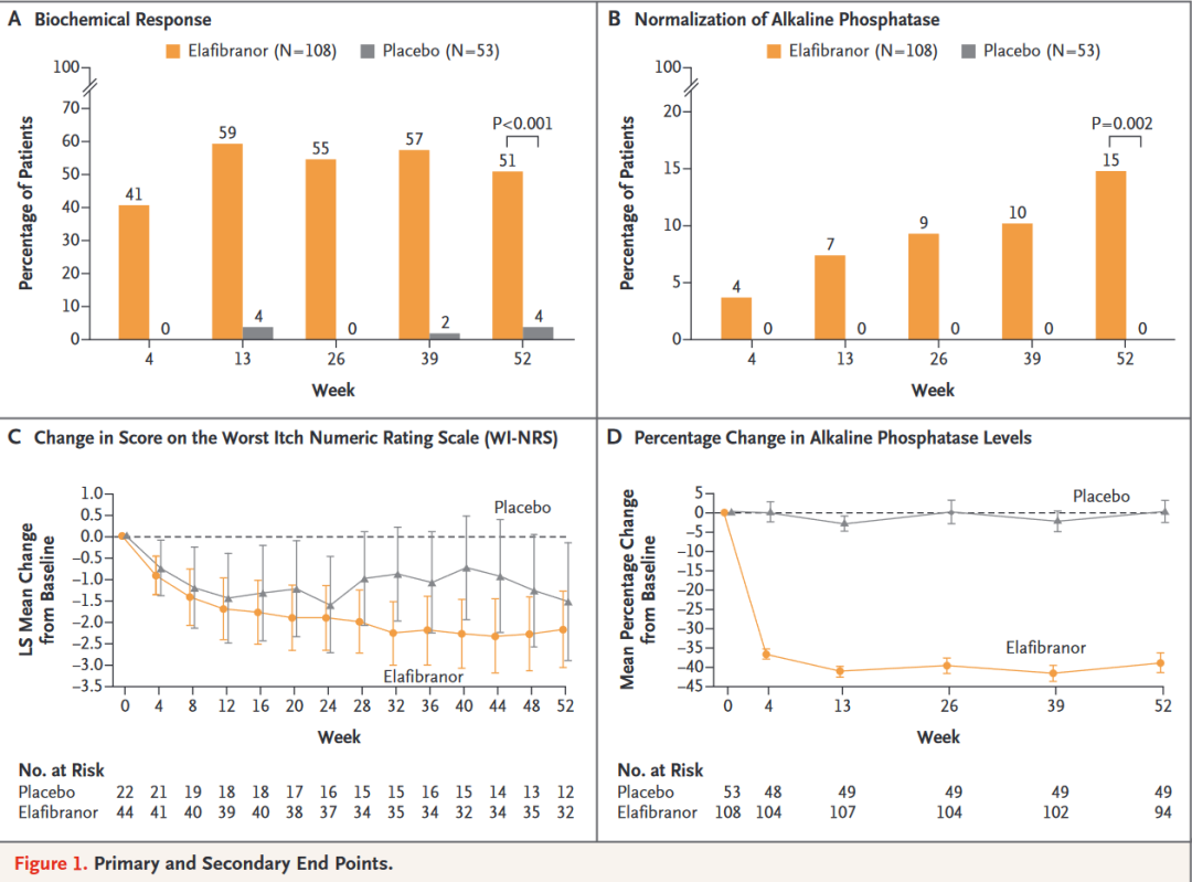 双重PPARα和δ激动剂Elafibranor的III 期多中心、双盲、随机对照临床试验[7]纳入对UDCA应答不充分或副作用无法耐受的18~75岁PBC患者,将患者按2:1随机分至试验组(Elafibranor 80 mg/d)或安慰剂组。结果显示,Elafibranor(80 mg)组中51%的患者达到胆汁淤积应答,而安慰剂组这一数值为4%(P<0.0001)。胆汁淤积应答定义为第52周时碱性磷酸酶(ALP)<1.67×ULN,ALP降低≥15%,总胆红素(TB)≤ULN(图2)。ALP和胆红素是疾病进展的重要预测因素。两者水平降低可提示胆汁淤积性损伤减轻,肝功能改善。此外,与安慰剂相比,Elafibranor治疗可明显改善胆汁淤积相关指标、改善瘙痒症状。