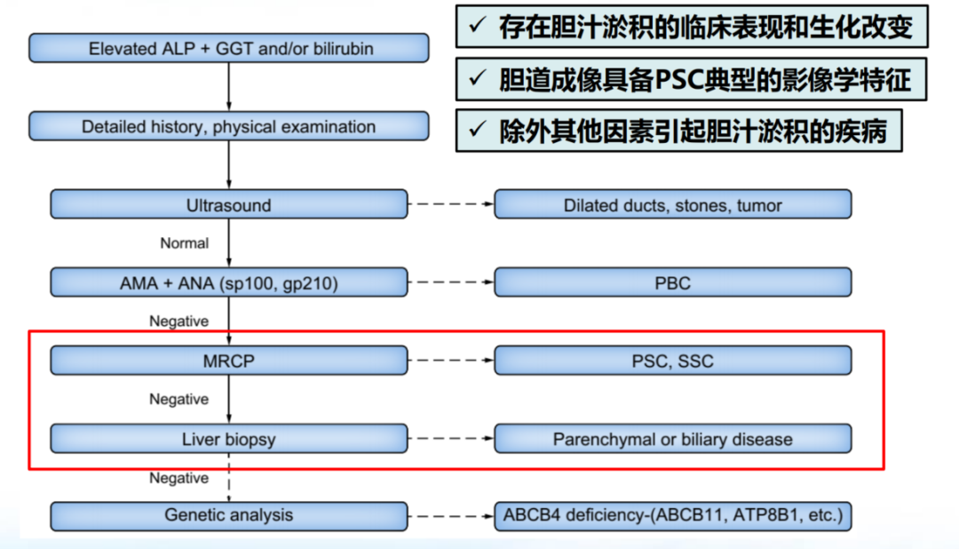 诊断PSC时,患者应存在胆汁淤积的临床表现和生化改变,胆道成像具备PSC典型的影像学特征,并除外其他因素引起胆汁淤积的疾病(图3)。