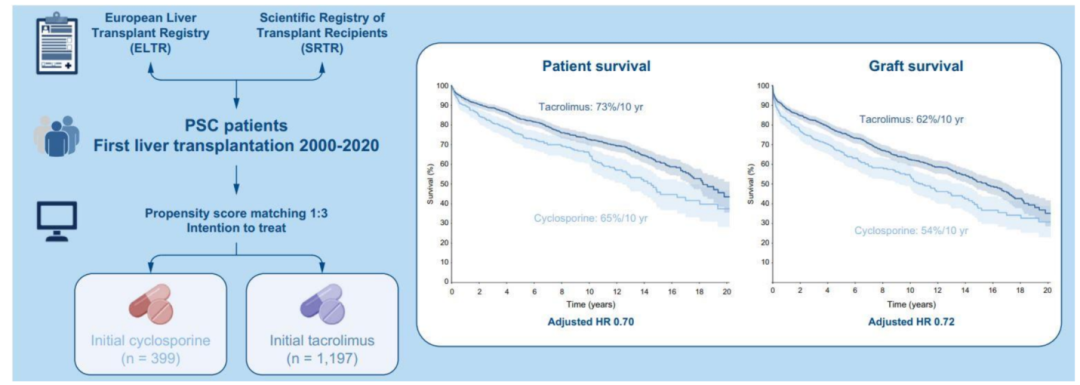 图4. 肝移植后环孢素vs.他克莫司的治疗研究方法和结果