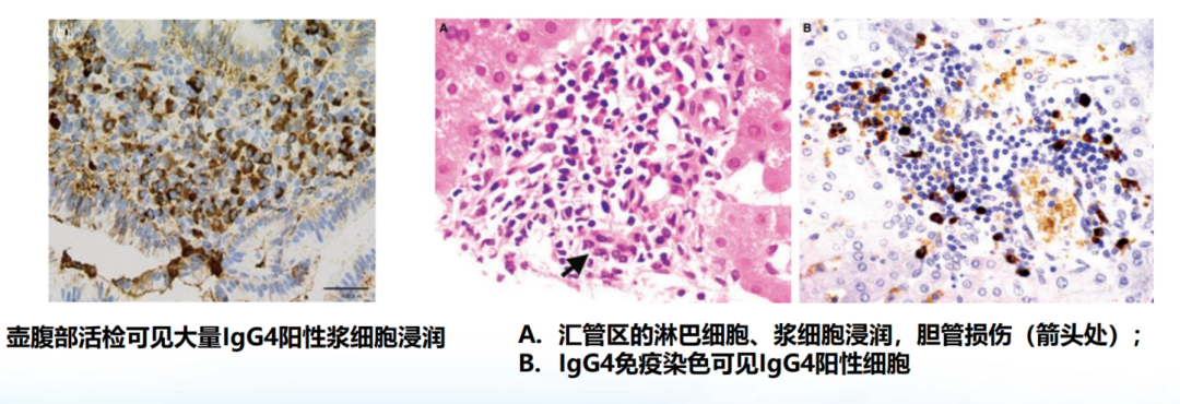 实验室检查方面,血清IgG4水平升高是IgG4-SC的重要特征,但不能单独依据血清IgG4升高诊断IgG4-SC。病理诊断方面,指南推荐病变组织中IgG4阳性浆细胞>10个/HPF,同时IgG4/IgG阳性浆细胞比例>40%(图5)。