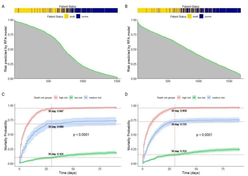 图1. 慢加急性肝衰竭患者30天死亡率的预测性能。(A)CBA模型预测死亡率与实际生存状态的比较。(B)RFA模型预测死亡率与实际生存状态的比较。(C)按CBA模型预测分类的慢加急性肝衰竭患者30天死亡概率。(D)按RFA模型预测分类的慢加急性肝衰竭患者30天死亡概率。