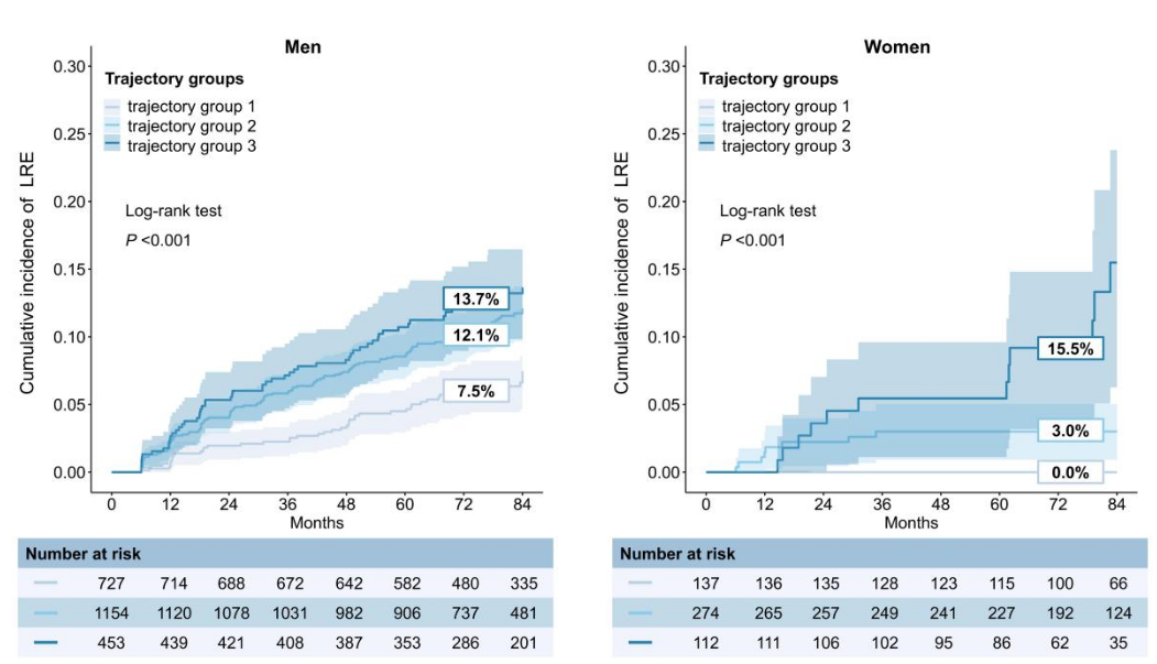 在Search-B队列中,LCMM分别构建了5个男性ALT轨迹组和6个女性ALT轨迹组。约90%的患者被划分到轨迹组1、2和3,其ALT水平相对稳定且呈梯度上升。在Kaplan–Meier分析中,3个轨迹组的7年LRE累积发病率也呈梯度上升。