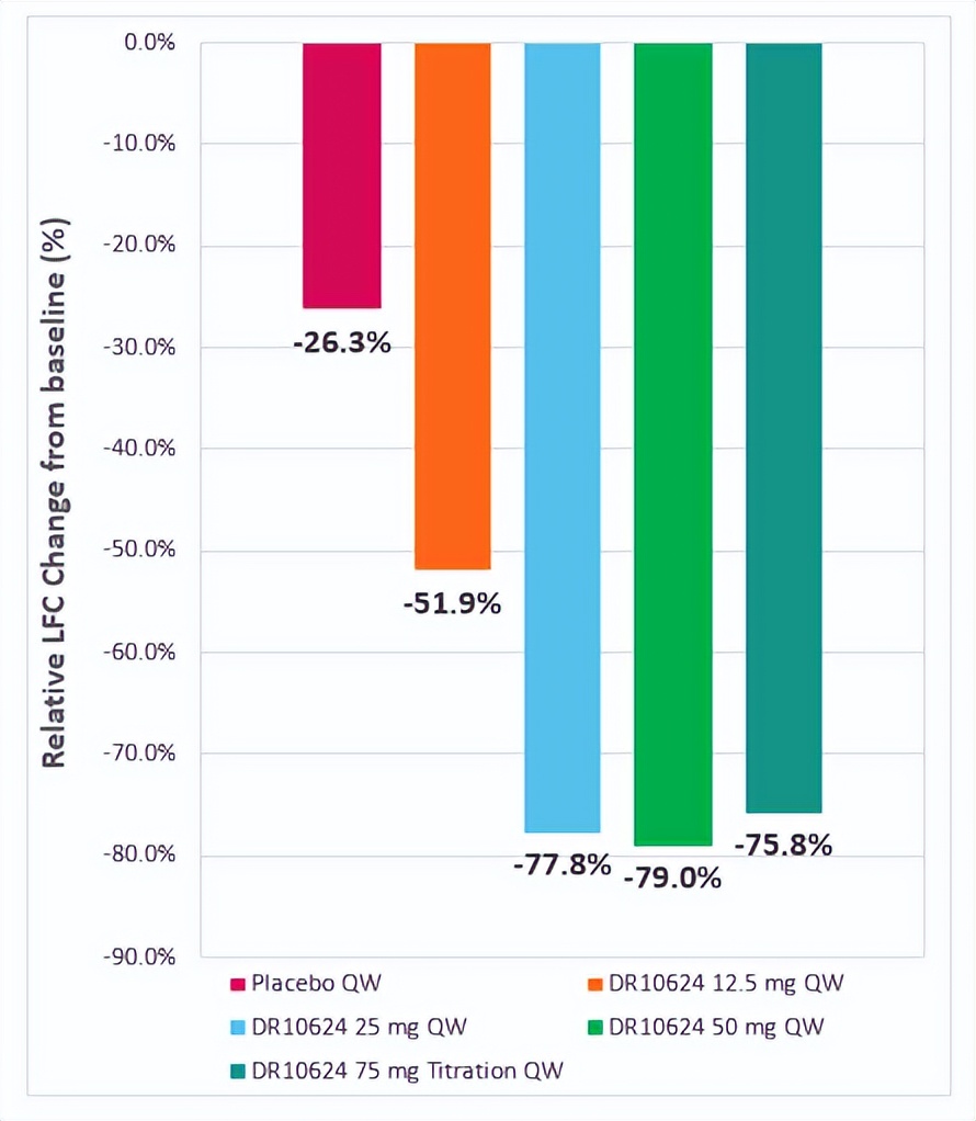 在基线肝脏脂肪含量≥8%的受试者中,DR10624的各剂量组(12.5 mg、25 mg、50 mg和75 mg剂量滴定组)的LFC较基线相对降幅分别为58.3%、83%、89.2%、和87.2%,显著高于安慰剂组的27.2%(表1)。