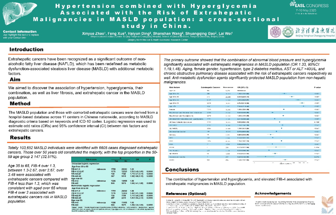 在2025年欧洲肝病学会年会(EASL)年会上,清华大学附属北京清华长庚医院魏来教授团队的两项关于代谢相关脂肪性肝病(MASLD)研究成果入选EASL。其中一项研究探讨了MASLD患者群发生肝外恶性肿瘤的风险因素,提出血压升高合并血糖升高,FIB-4>1.3是MASLD人群发生肝外恶性肿瘤的风险因素。另一项研究则通过单细胞转录组学分析显示甲状腺激素受体(THR)-β激动剂治疗代谢相关脂肪性肝炎(MASH)增加肝脏巨噬细胞比例抑制补体激活途径。两项研究对MASLD临床结局的预测和人群肿瘤筛查提供数据参考,在MASH治疗方面,提示THR-β激动剂能够增加肝组织巨噬细胞比例,并抑制细胞中的补体激活途径,使得肝细胞和巨噬细胞之间的通讯增强。