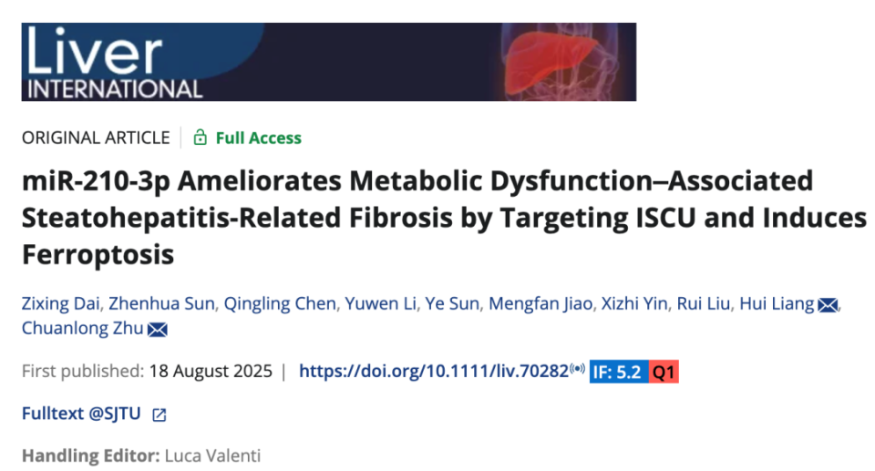 原文链接:Dai Z, Sun Z, Chen Q, Li Y, Sun Y, Jiao M, Yin X, Liu R, Liang H, Zhu C. miR-210-3p Ameliorates Metabolic Dysfunction-Associated Steatohepatitis-Related Fibrosis by Targeting ISCU and Induces Ferroptosis. Liver Int. 2025 Sep;45(9):e70282. doi: 10.1111/liv.70282. PMID: 40824511.