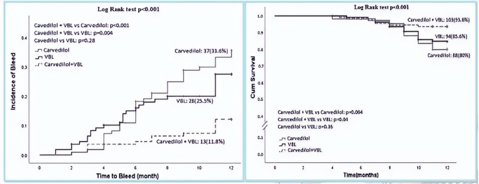 卡维地洛在降低失代偿率和病死率方面优于普萘洛尔。研究显示,卡维地洛组1年、2年、3年和5年失代偿累积发生率均显著低于传统NSBB组(8.3% vs. 13.0%;16.7% vs. 28.4%;22.3% vs. 48.6%;30.2% vs. 59.1%),风险比(SHR)为0.61;同样,卡维地洛组1年、2年、3年和5年病死率也显著降低(19.8% vs. 44.5%;31.3% vs. 49.3%;45.9% vs. 57.0%;53.0% vs. 72.2%),SHR为0.57[3]。